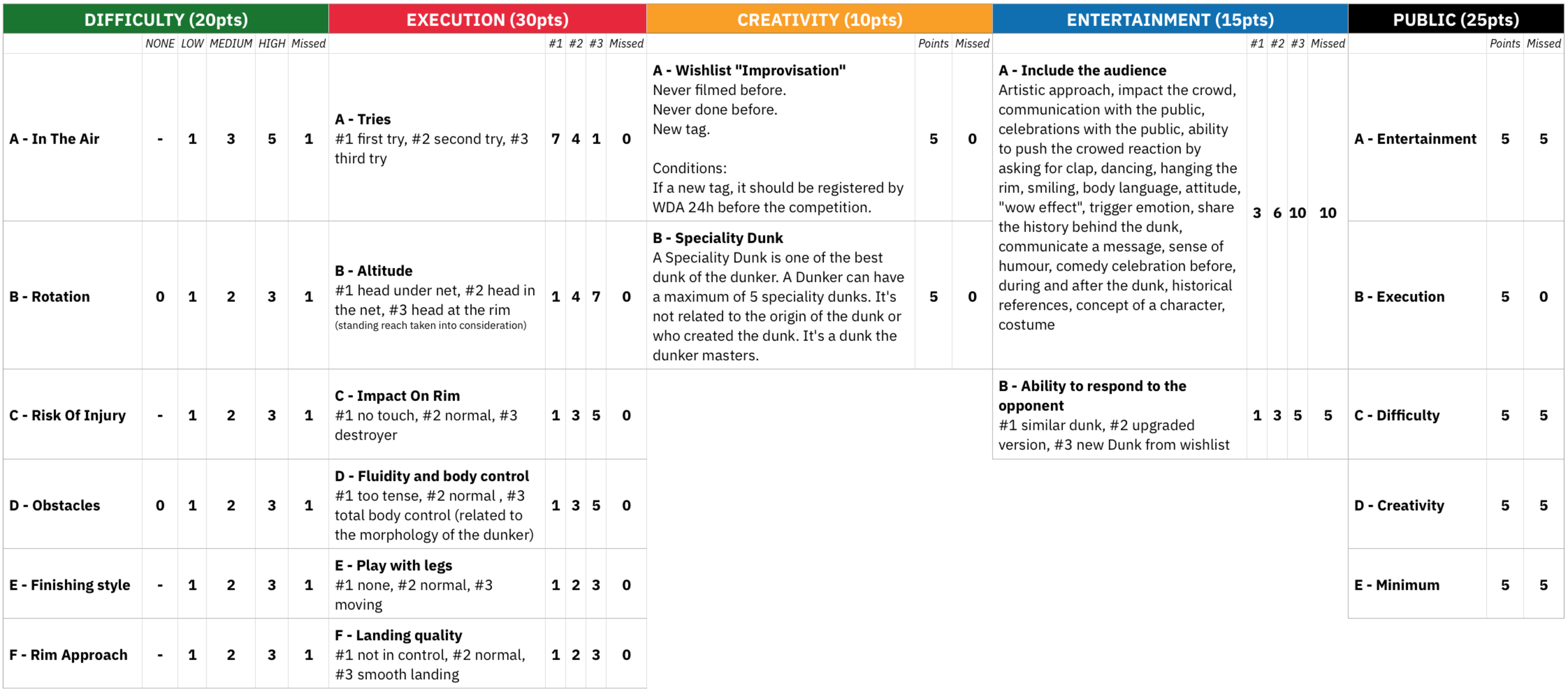 The A to F sub-criteria have 3 levels of score depending the quality of the execution. The judge of execution will give points regarding his/her appreciation. If the dunk is missed after 3 tries, the execution score is 0.